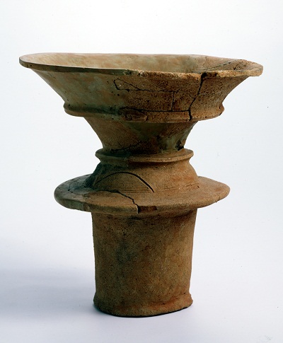 壷形といっても、実際にものを貯える部分は省略されています。写真下の筒状部分を円筒埴輪に差込み、壷がのっているように見せていました。後に円筒埴輪と一体化し、朝顔形埴輪としてつくられるようになりました。