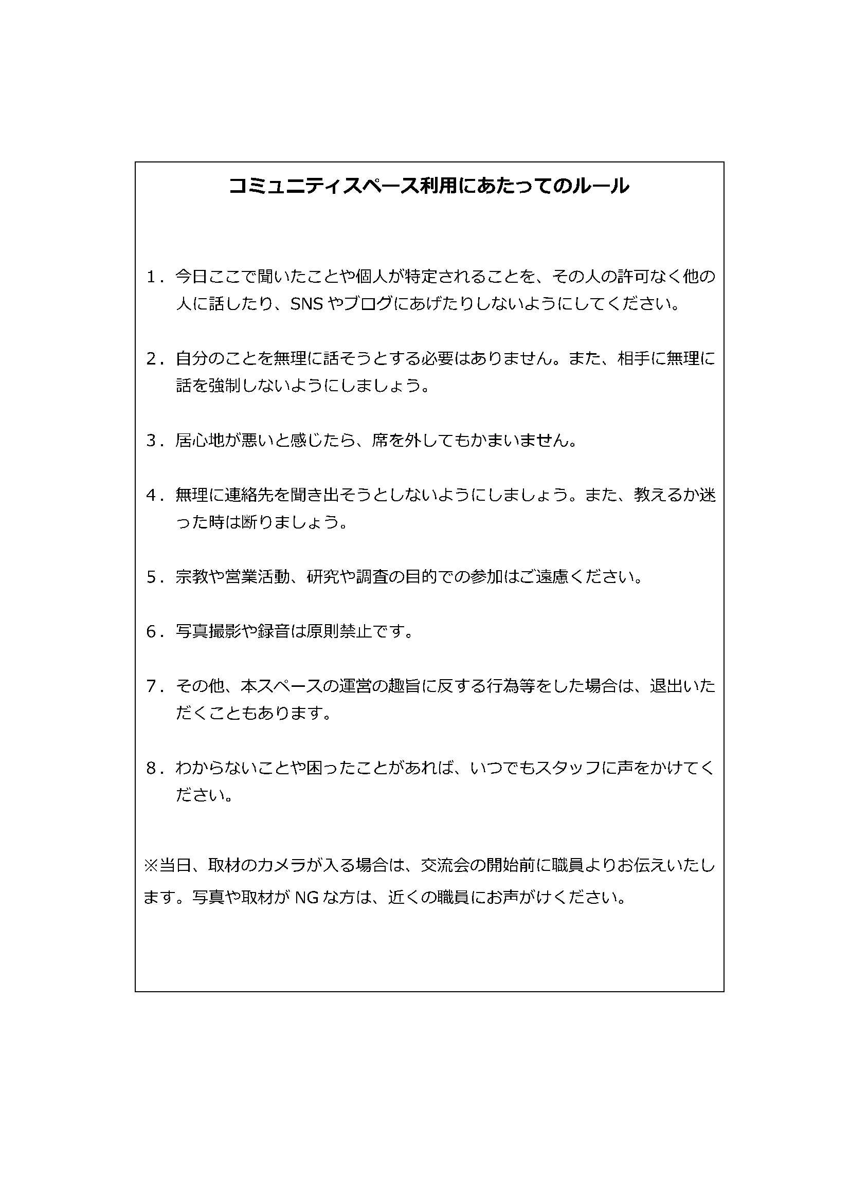 ・コミュニティスペース利用にあたっては、チラシ裏面に記載のルールを守っていただきます