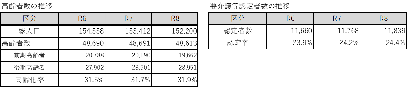 前期高齢者数は減少傾向にありますが、後期高齢者数は増加傾向にあります。市全体の人口は減少傾向となっており、高齢化率は年々増加し続けていきます。認定者数と認定率は、ほぼ横ばい状態です。
