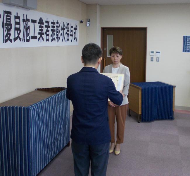 令和5年8月2日(水曜日)に市役所議会棟第3・4委員会室において、令和4年度に完成した工事を対象とする優良工事の表彰状授与式が行われ、最優秀優良工事業者1社、優良工事業者3社、最優秀技術者2名、優秀技術者4名が表彰されました。