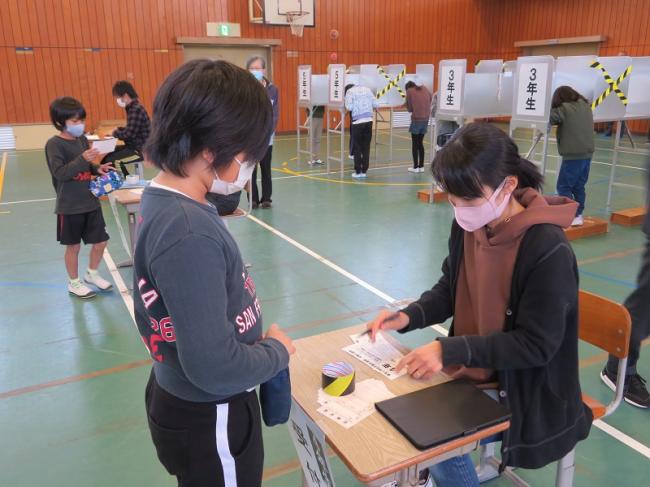 11月11日(水曜日)、飯南管内の粥見小学校で行われた児童会選挙にて、選挙啓発事業を実施しました。