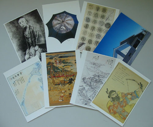 武四郎肖像、骸骨図縫付傘、天満宮奉納神鏡拓本、記念館外観、北海道国郡図、大台山頂眺望図、蝦夷漫画の資料写真7枚が入ったお得な絵葉書セットです。