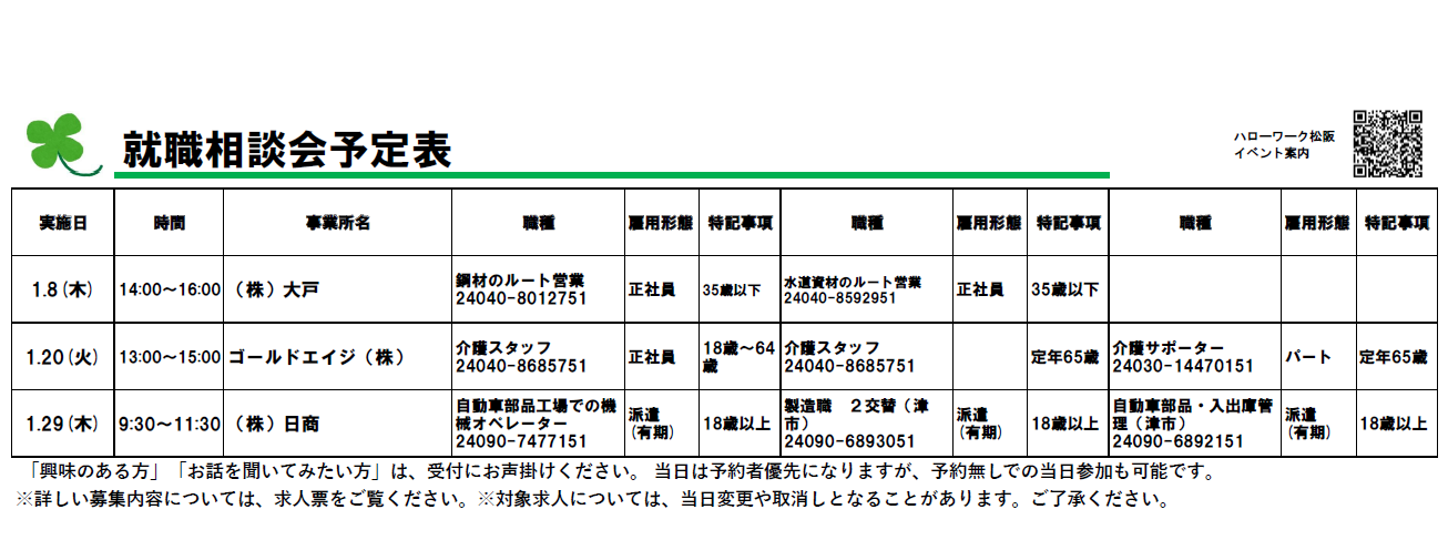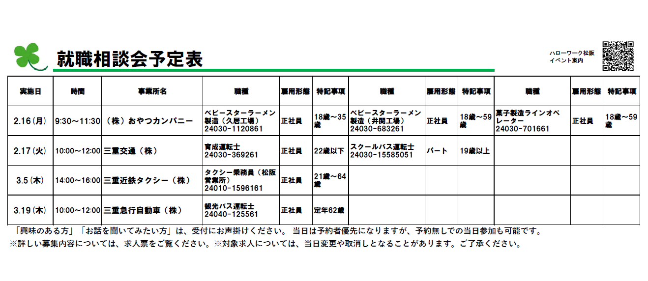 - 掲載情報以外の求人情報を知りたい方は、ハローワークインターネットサービスをご利用いただくか、ハローワーク松阪の紹介窓口へお問い合わせください。