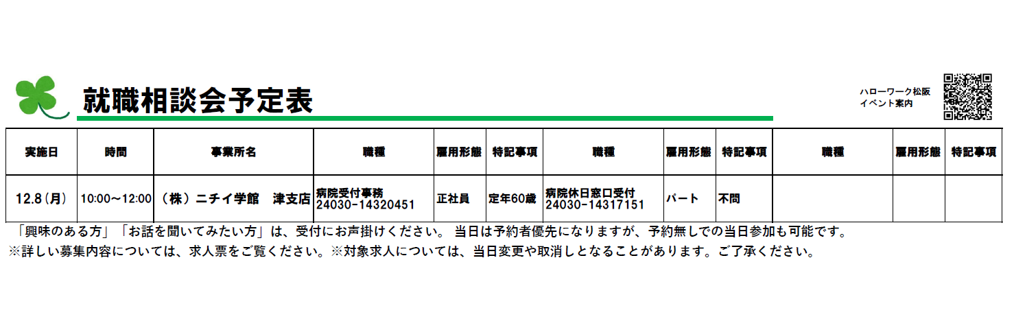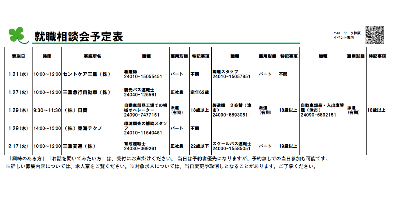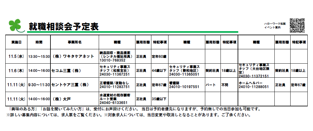 - 「興味のある方」「お話を聞いてみたい方」は、ハローワーク松阪の受付にお声掛けください。当日は予約者優先になりますが、予約無しでの当日参加も可能です。