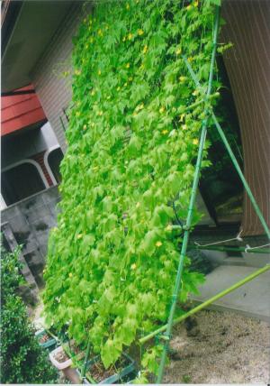 今年は肥料を全く与えなかったせいか、いまいちの出来でしたが、植えっぱなしでも簡単に収穫も出来て、涼しくて一石二鳥です。ゴーヤおすすめです。