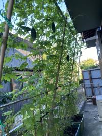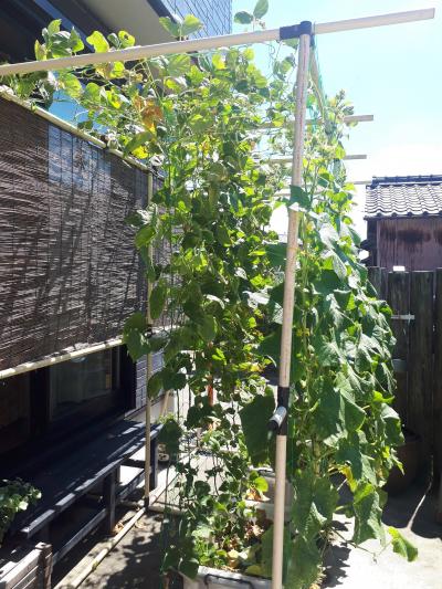 6月初めに苗を植え7月に入るといっきに伸び花が咲き、夫婦で食べきれないほど沢山の実を収穫できた。9月末までは収穫できると期待してます。胡瓜は沢山の実がなり、朝顔もきれいに咲いています。ゴーヤも小さい黄色の花が沢山咲いてきれいです。西側の窓に植えましたが、日よけがよく室内は涼しく、西日が入らないので室内の日焼けも少ない。又、前に電車が走っているので騒音防止にもなっています。